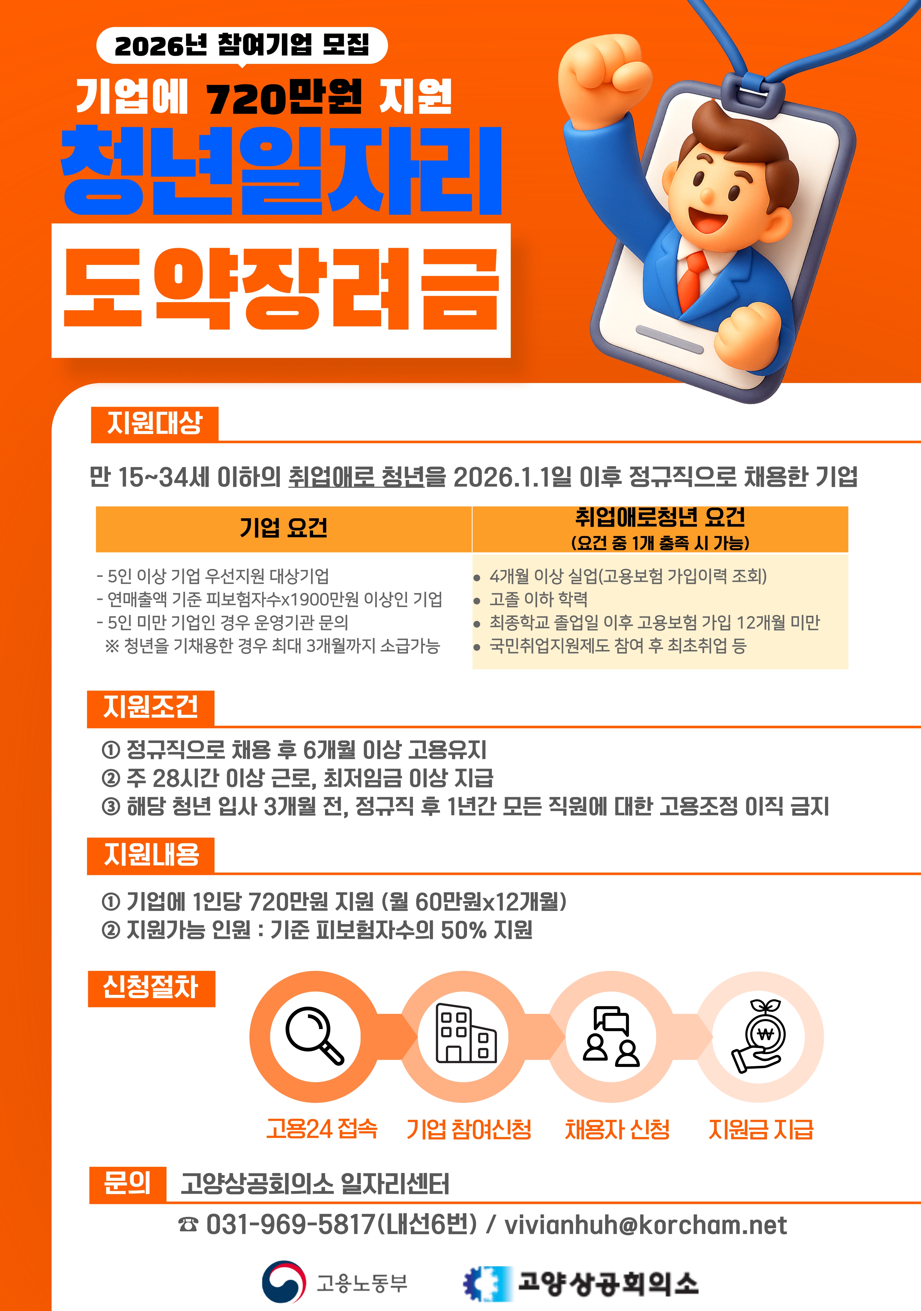 안녕하세요. 고양상공회의소 청년일자리도약장려금 담당자입니다. 고용노동부의 청년일자리도약장려금은 청년을 채용한 기업에 최대 720만원을 지원합니다. 현재 2026년도 기업 참여 신청을 받고 있습니다. 관심 있는 기업들의 많은 참여 부탁드립니다. □ 청년일자리 도약장려금 사업이란? 만15세~34세의 미취업 상태인 취업애로 청년을 2026.1.1 이후 정규직으로 신규 채용한 기업에 1년간 최대 720만원을 지원하는 고용노동부 사업입니다.
