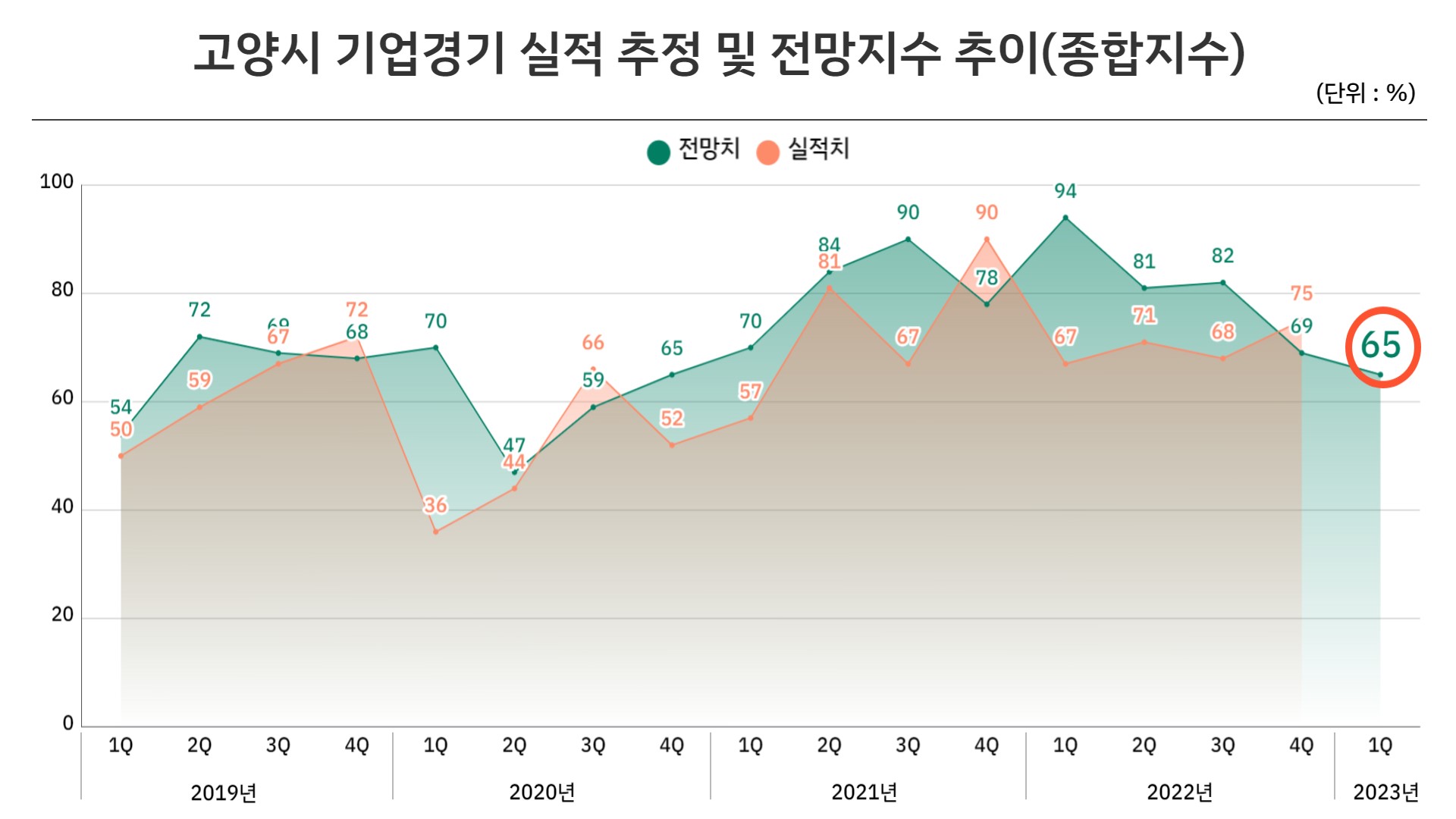 2023년 고양시 기업들의 1분기 체감경기가 2022년 4분기 69P(포인트)에서, 4포인트 하락한 65p(포인트)로 집계됐다. 이는 2019년 1/4분기 54P(포인트) 이후 1분기 전망치 중 가장 낮은 수치이다.