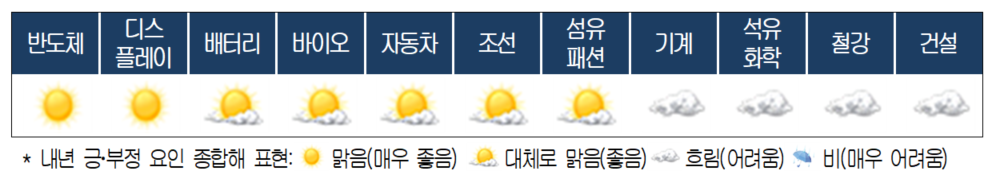 내년 산업기상도는 AI를 뒷받침하는 반도체, 디스플레이 등에 쾌청한 날씨가 이어질 것으로 전망됐다. 중국과 경쟁중이고, 관세 외풍이 두드러지는 유화, 철강, 기계 등은 어려움이 지속될 것으로 보인다.