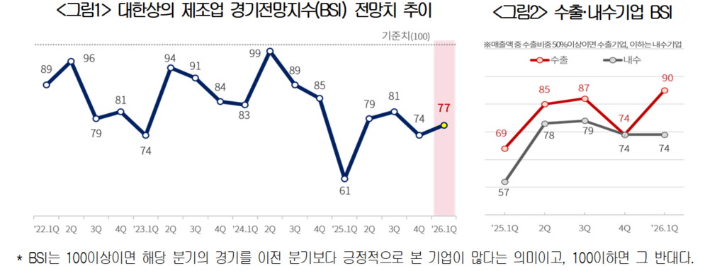 대한상공회의소(회장 최태원)가 전국 2,208개 제조기업을 대상으로 ‘2026년 1분기 기업경기전망지수(BSI)’를 조사한 결과, 직전 분기 전망치인 ‘74’보다 3p 상승한 ‘77’로 집계되어 2021년 3분기 이후 18분기 연속 기준치(100)를 밑돌았다. 관세충격으로 급락했던 수출기업의 전망지수가 ‘90’으로 16p 상승했지만 내수기업의 전망지수는 ‘74’에 그치며 전체 체감경기 상승의 발목을 잡았다.