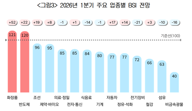 전체 14개 조사대상 업종 중 ‘반도체’와 ‘화장품’의 2개 업종만이 기준치 100을 상회하며 업황 상승세를 보였다. 반도체는 AI 확산과 데이터센터 투자 확대에 따른 고대역폭메모리(HBM) 수요 증대와 범용 메모리 공급 부족에 따른 가격 상승세가 맞물려 전 분기 대비 22p 상승한 ‘120’을 기록했고, 화장품은 북미, 일본, 중국 등 글로벌 시장 에서 K-뷰티 위상 강화로 수출 호조세가 이어지며 가장 큰 상승폭(+52p)을 보였다.