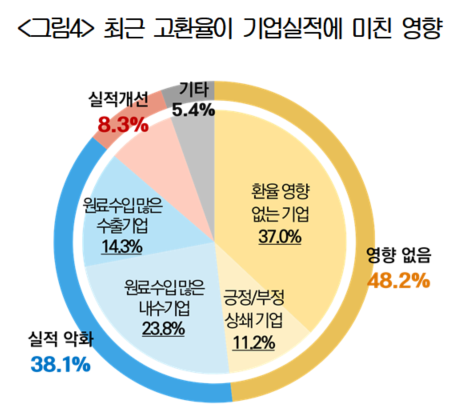 최근 지속된 고환율로 인해 ‘기업실적이 악화됐다’고 있다는 답한 기업은 총 38.1%였다. 이 중에 ‘원부자재 수입이 많은 내수기업’이 23.8%로 높은 비중을 보였고, ‘수출비중이 높음에도 수입원가 상승이 더 크다’는 기업도 14.3%였다. 이에 반해 ‘고환율 효과로 수출실적이 개선됐다’고 답한 기업은 8.3%에 그쳤다.