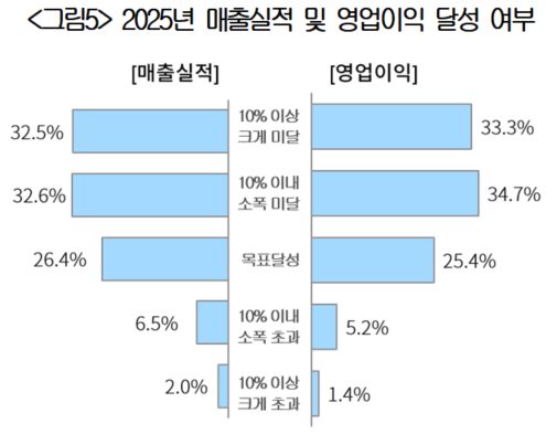 올해 기업들의 경영성과는 목표치에 미치지 못했다는 응답이 많았다. 매출실적의 경우, 전체기업의 65.1%가 연초 목표 대비 미달했다고 답했는데, ‘10%이상 미달’이라는 응답이 32.5%, ‘10%이내 미달’이란 응답은 32.6%로 유사하게 나왔다.