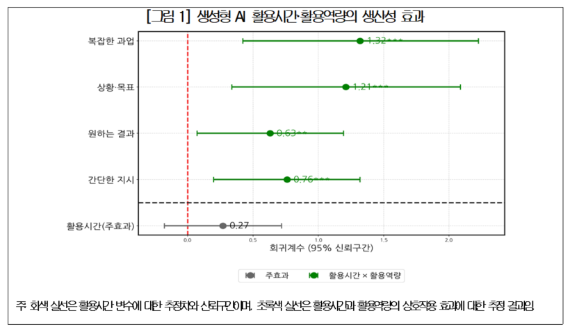 생성형 AI 활용과 업무 생산성 간 관계에 대한 회귀분석 결과, 생성형 AI 사용 시간 자체를 늘리는 것만으로는 생산성 향상이 나타나지 않았으나, 프롬프트 작성 능력이 높아질수록 통계적으로 유의한 생산성 개선 효과가 확인됐다. 이는 생성형 AI의 성과가 단순한 사용량 확대가 아니라 활용 역량의 수준에 의해 좌우되며, AI 리터러시 강화를 통해 개인 업무 효율성 제고를 넘어 기업 성과 전반의 개선으로 확장될 수 있음을 시사한다.