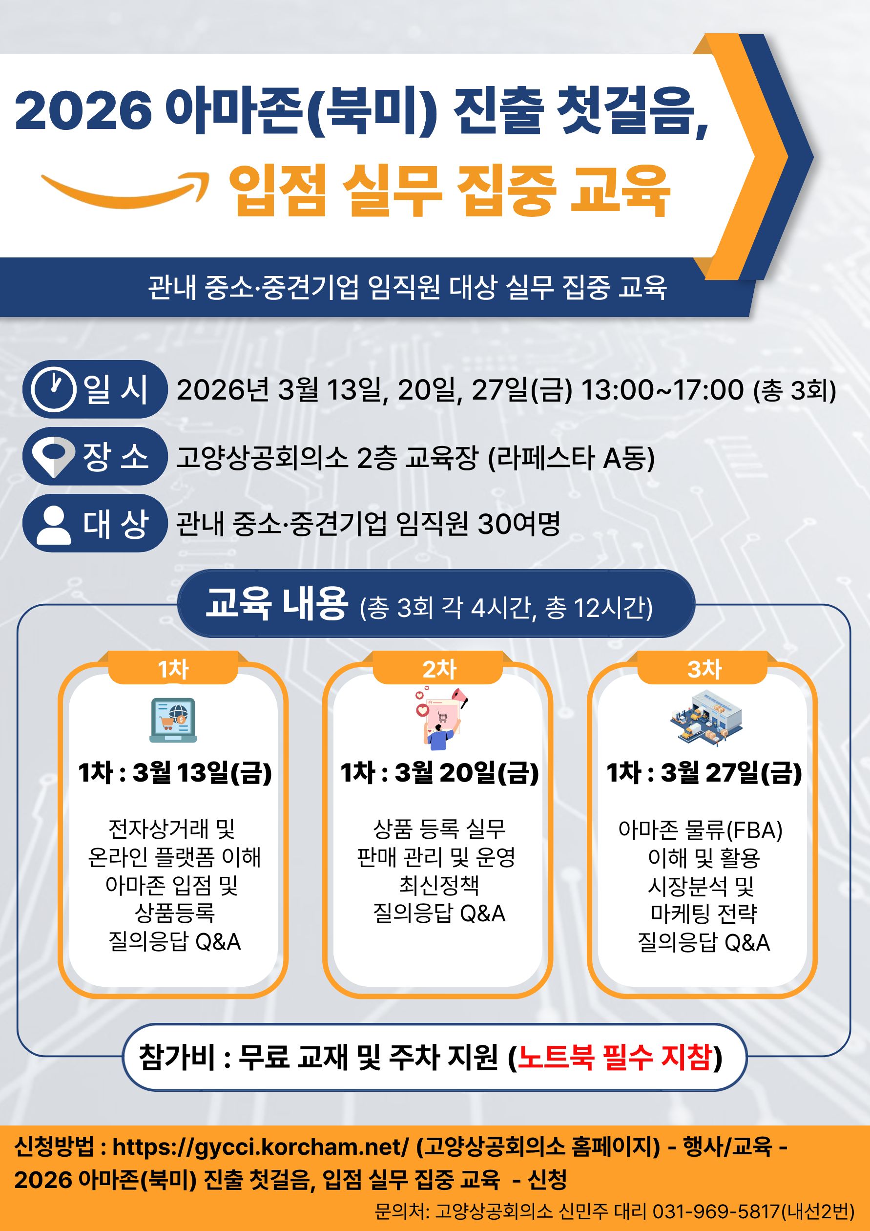 가. 일시: 2026년 3월 13일,20일,27일(금) 13:00~17:00 (총 3회) 나. 장소: 고양상공회의소 2층 교육장 다. 대상: 관내 중소·중견기업 임직원 30여명 (선착순으로 접수를 받으며, 신청이 되었더라도 선착순으로 마감되어 참여가 어려우실 수 있습니다.) 라. 내용: 아마존(북미) Seller 계정 개설 및 상품 등록, 마케팅 전략